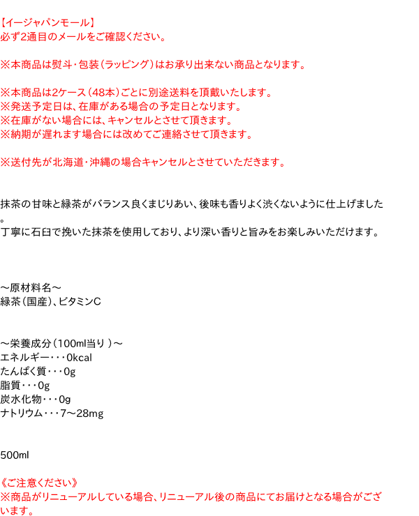 〜原材料名〜 緑茶(国産)、ビタミンC 〜栄養成分(100ml当り )〜 エネルギー・・・0kcal たんぱく質・・・0g 脂質・・・0g 炭水化物・・・0g ナトリウム・・・7〜28mg 500ml【広告文責】株式会社イージャパンアンドカンパニーズ 072-875-6666《ご注意ください》 ※本商品はキャンセル・返品・交換不可の商品です。