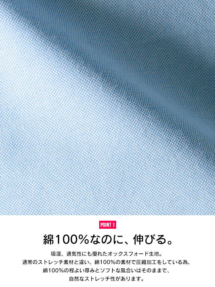 <ナチュラルストレッチシャツシリーズ>通常のストレッチ素材と違い、綿100%の素材で圧縮加工をしている為、綿100%の程よい厚みとソフトな風合いはそのままで、自然なストレッチ性があります。